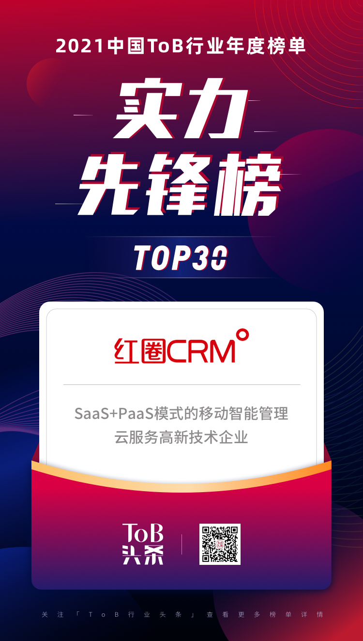 12月27日,「ToB行業(yè)頭條」聯(lián)手3W集團正式發(fā)布了《2021ToB行業(yè)年度榜單·實力先鋒榜》,評選出了2021年ToB領域各賽道最具實力的先鋒企業(yè)TOP30?!昂蛣?chuàng)科技(紅圈CRM)”作為數(shù)字化智能企業(yè)云服務領域的先鋒企業(yè),入選榜單行列!