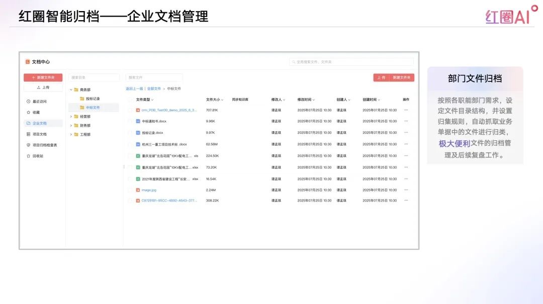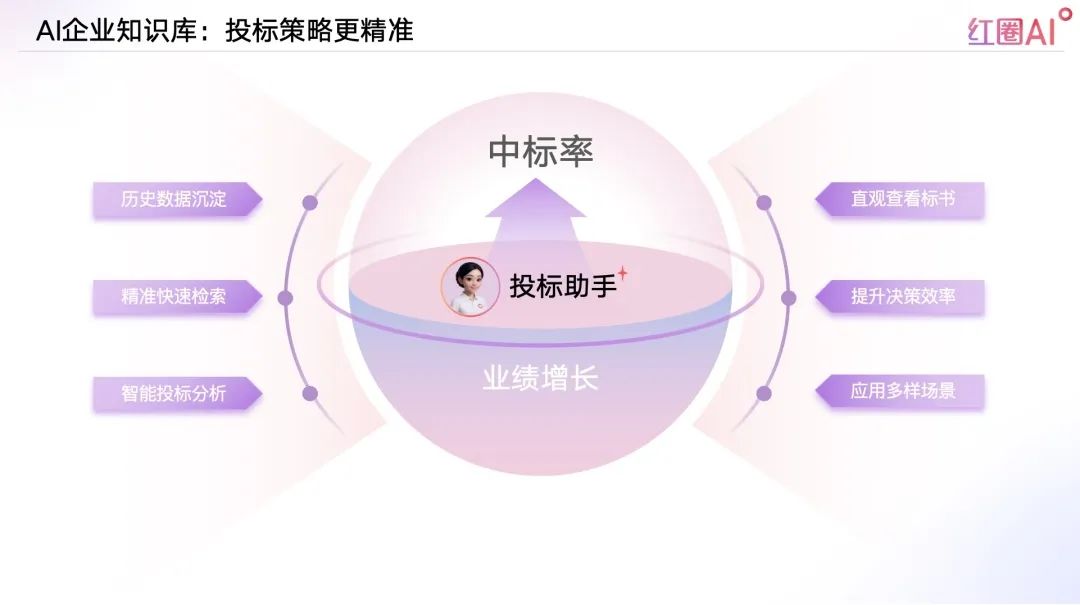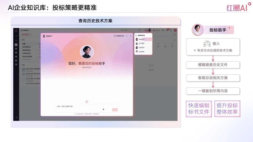 以往投標(biāo)流程中,資料查找和內(nèi)容比對耗時耗力、風(fēng)險頻發(fā)。紅圈AI通過快速檢索歷史標(biāo)書、技術(shù)方案、成功案例等內(nèi)容,助力企業(yè)建立專屬“投標(biāo)智庫”,讓策略制定更具數(shù)據(jù)支撐。