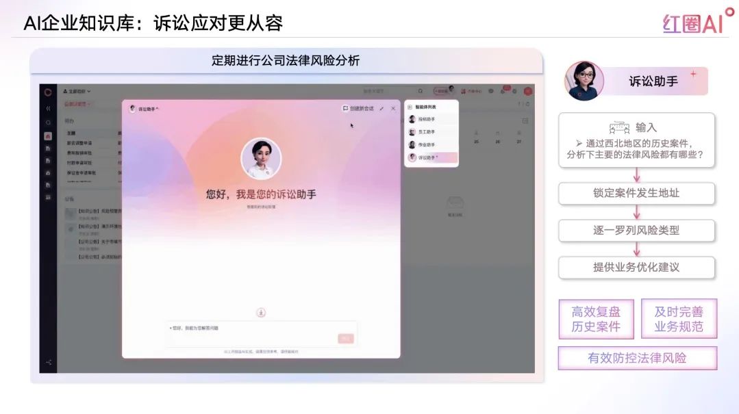 AI定期進(jìn)行公司法律風(fēng)險分析,訴訟助手高效復(fù)盤歷史案件,及時完善業(yè)務(wù)規(guī)范,有效防控法律風(fēng)險。