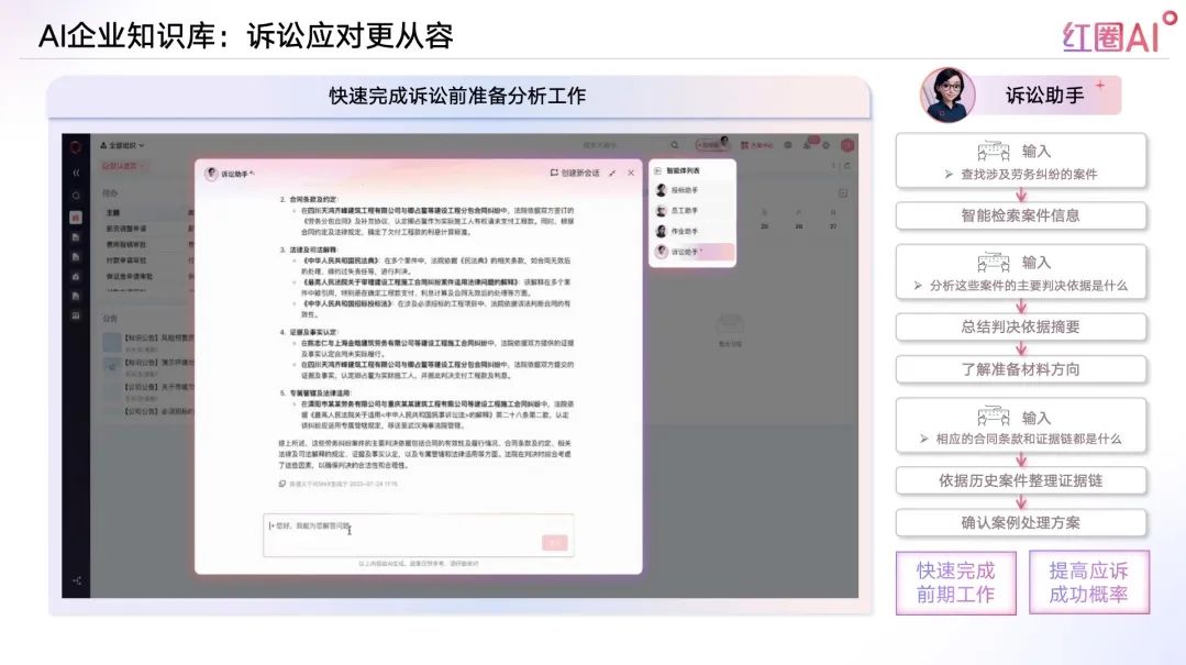 面對工程糾紛突發(fā)性強、資料復(fù)雜的挑戰(zhàn),紅圈AI構(gòu)建訴訟智庫,協(xié)助法務(wù)快速調(diào)閱判例、合同、律師函、內(nèi)部分析等核心資料,高效支撐應(yīng)訴與風(fēng)險防控。