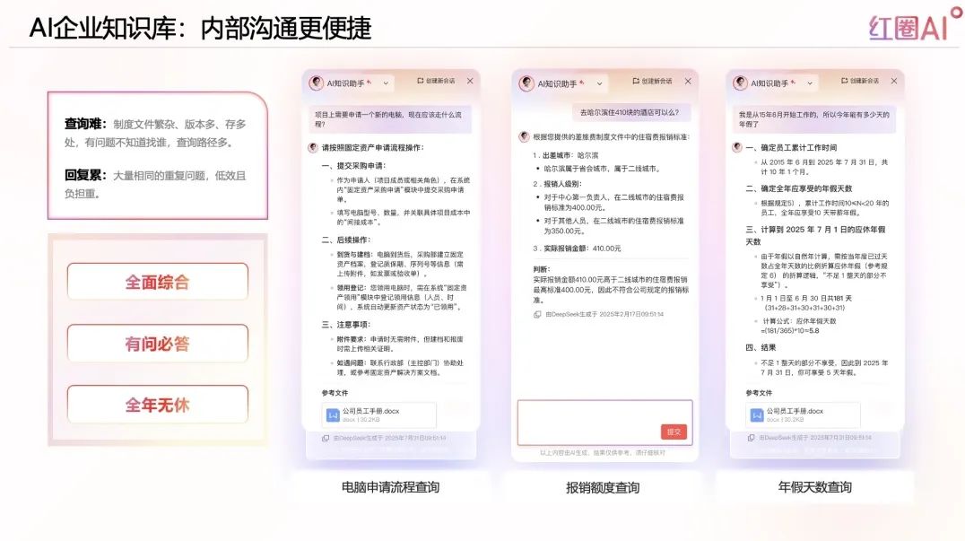 員工常見問題如流程、制度、額度等,在傳統(tǒng)體系下查詢不便、響應(yīng)緩慢。紅圈AI通過自然語言對話,打造全天候問答系統(tǒng),全面提升辦公效率。