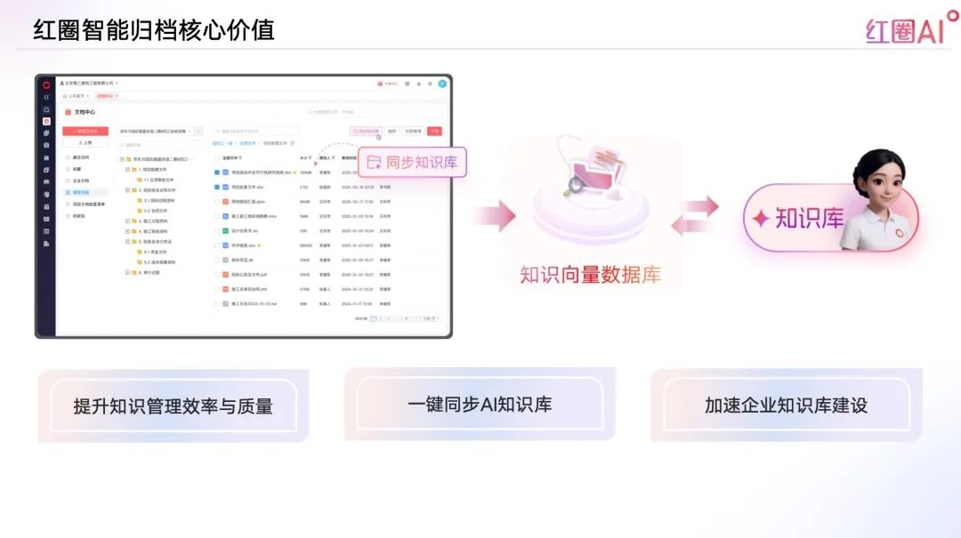 紅圈AI,以大模型+智能檢索技術(shù)為引擎,構(gòu)建企業(yè)知識資產(chǎn)體系,實現(xiàn)“經(jīng)驗即問即答”,推動企業(yè)從“人找知識”走向“知識找人”。