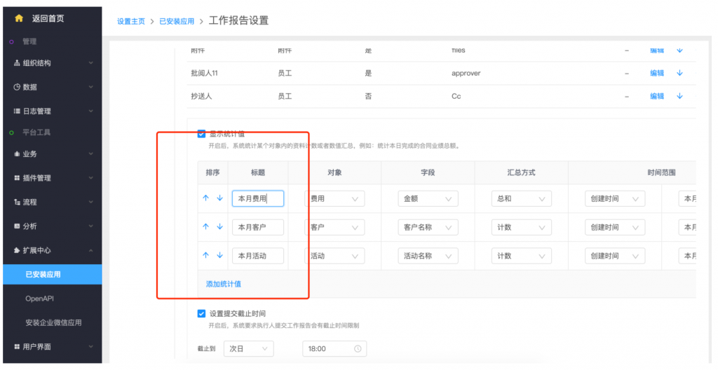 - 后臺(tái)設(shè)置:系統(tǒng)設(shè)置——擴(kuò)展中心——已安裝應(yīng)用——工作報(bào)告,類(lèi)型設(shè)置支持新建類(lèi)型;在模板設(shè)置中,可以按業(yè)務(wù)類(lèi)型設(shè)置不同的字段和統(tǒng)計(jì)值;統(tǒng)計(jì)值設(shè)置,支持自定義名稱(chēng);