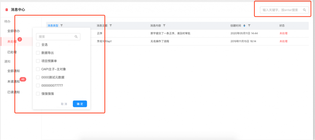 - 消息通知的類(lèi)型和主題進(jìn)行了規(guī)范,便于進(jìn)行分類(lèi)和篩選;每條消息可明確看到業(yè)務(wù)來(lái)源,主題更加清晰,大幅度減少了以“通知”為標(biāo)題的消息;同時(shí)查看或處理變?yōu)檎锌牲c(diǎn)擊;消息支持篩選和搜索,也可以直接搜索內(nèi)容或主題;待辦和通知的狀態(tài)變化更加智能,去除了手動(dòng)按鈕操作,當(dāng)處理或查看詳情后,狀態(tài)會(huì)自動(dòng)變化;同時(shí)優(yōu)化了紅點(diǎn)顯示數(shù)量的刷新機(jī)制,更新更及時(shí).
