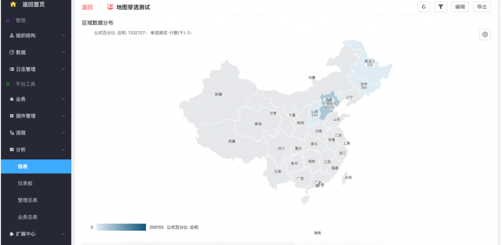 - 地圖可設(shè)置默認(rèn)顯示區(qū)域,區(qū)域可進(jìn)行向下鉆取,如點擊北京市,可查看北京各區(qū)的數(shù)據(jù)。每個區(qū)域的顏色代表數(shù)值的大小,顏色越深數(shù)值越大