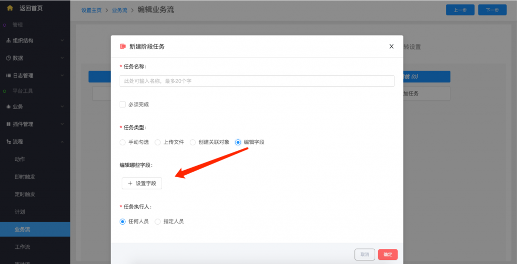 - 業(yè)務(wù)流添加階段任務(wù),新增“編輯字段”類型任務(wù),所有設(shè)置的字段均為必填