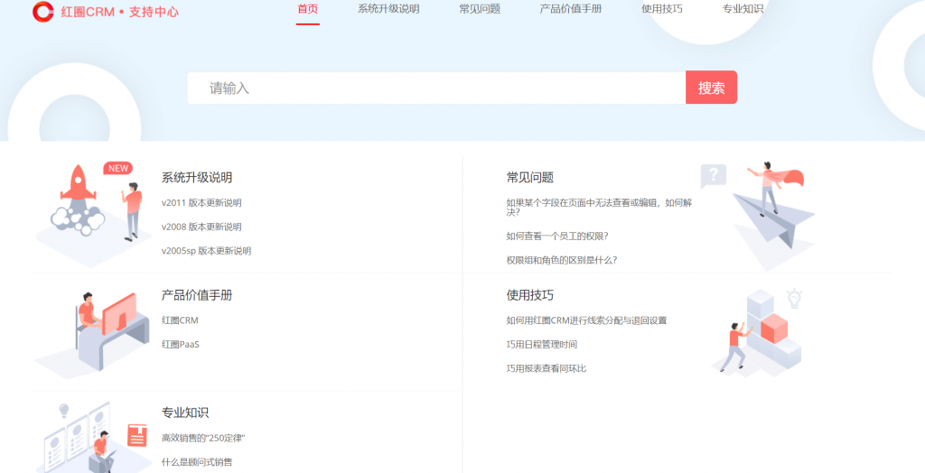 支持中心包含產(chǎn)品價(jià)值手冊(cè)、版本更新說明、常見問題、常用技巧和專業(yè)知識(shí)五部分,用戶可方便查找相關(guān)內(nèi)容。在前臺(tái)頁(yè)面右上角點(diǎn)擊“支持中心”可直接進(jìn)入支持中心。