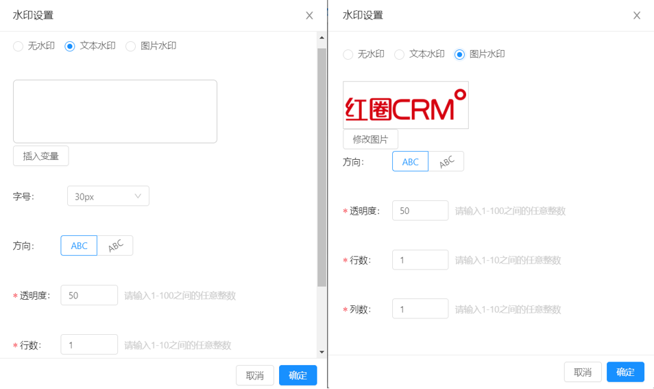 水印設(shè)置,支持文字和圖片水印,其中文字水印可以取系統(tǒng)字段作為變量