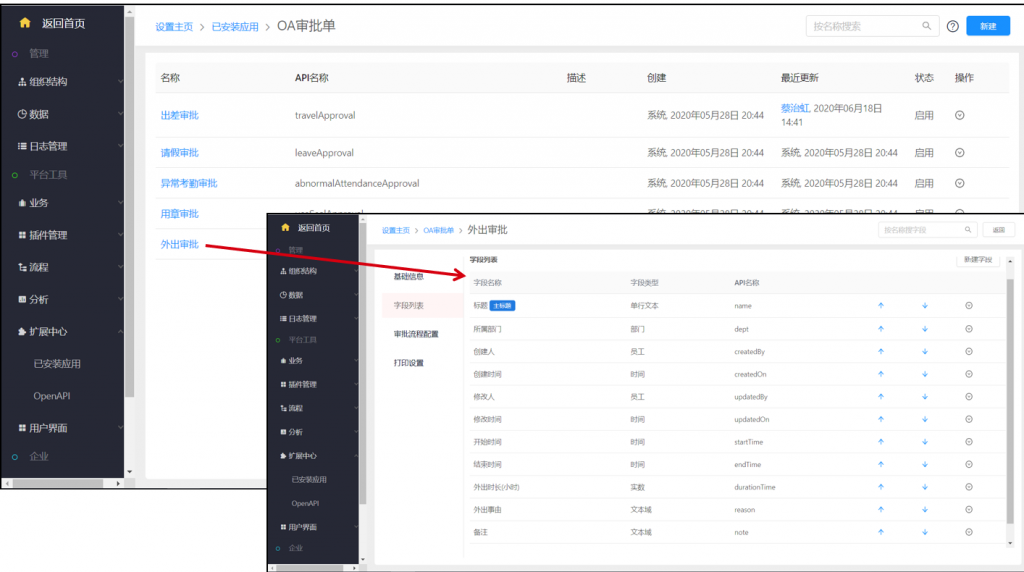 4)在OA審批單中增加“外出”審批,默認(rèn)內(nèi)置了開(kāi)始時(shí)間、結(jié)束時(shí)間、外出時(shí)長(zhǎng)、外出事由等字段;