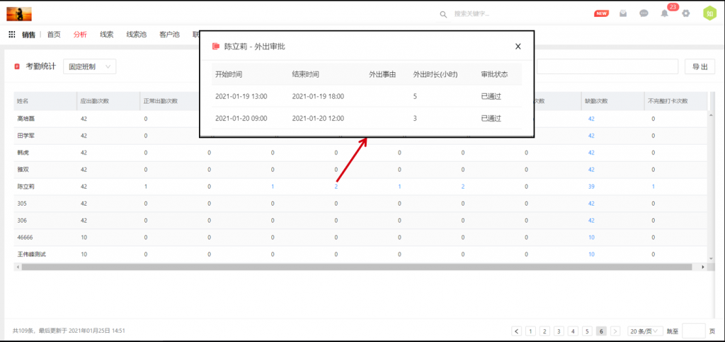 5)OA審批單中增加外出類型,外出、出差審批都可以修復(fù)異常打卡,并在考勤統(tǒng)計(jì)中可以穿透. 異常考勤包括:遲到、早退、缺勤。
