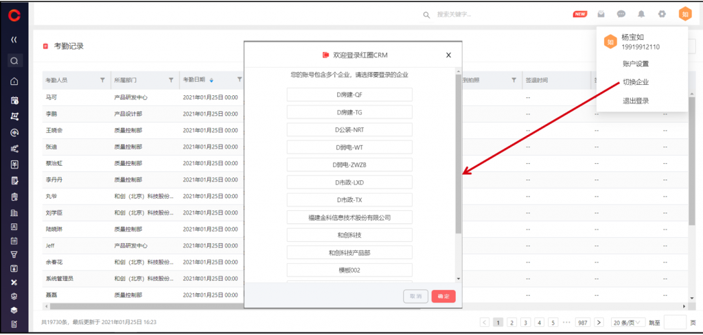 網(wǎng)頁(yè)端登錄系統(tǒng)后,支持 切換企業(yè),無(wú)需退出登錄重新登錄