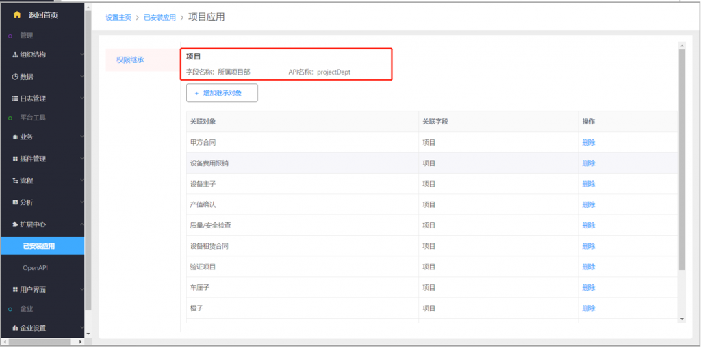 1)開(kāi)通項(xiàng)目多維度后,在后臺(tái)已安裝應(yīng)用中,可以看到“項(xiàng)目應(yīng)用”;打開(kāi)后可以看到項(xiàng)目上已經(jīng)增加的部門字段名稱和API