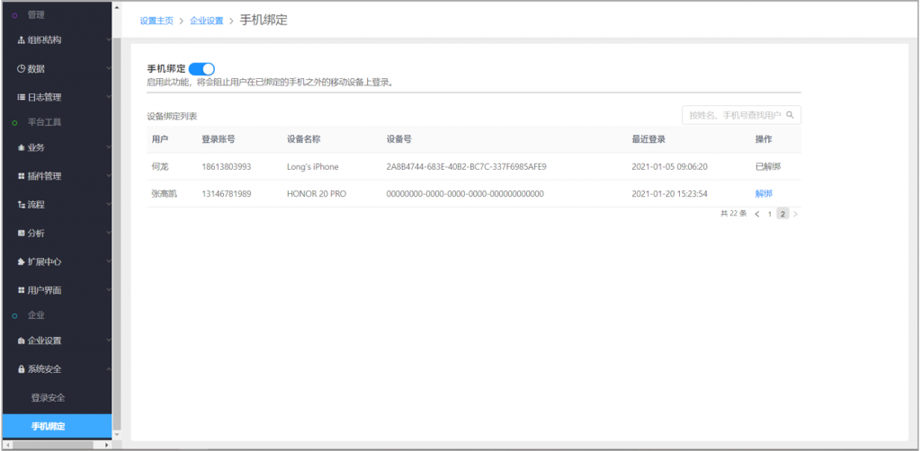 后臺(tái)-系統(tǒng)安全-手機(jī)綁定(需先開(kāi)啟配置權(quán)限),可開(kāi)啟手機(jī)設(shè)備綁定