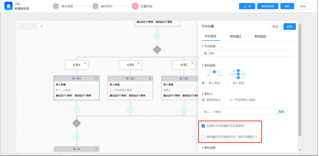3)當(dāng)節(jié)點(diǎn)審批人沒(méi)有數(shù)據(jù)權(quán)限時(shí),可以通過(guò)配置實(shí)現(xiàn)臨時(shí)授權(quán),還能再審批后添加為跟進(jìn)人,在保持?jǐn)?shù)據(jù)權(quán)限的不擴(kuò)散的前提下,保障特殊審批節(jié)點(diǎn)的順利推進(jìn)
