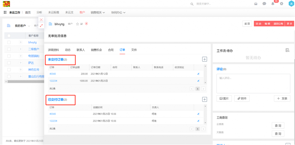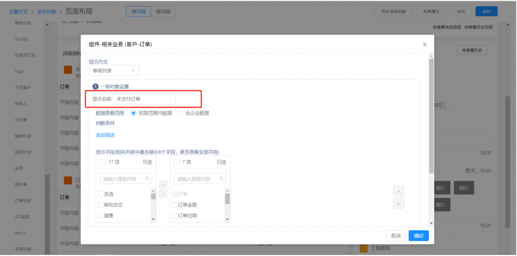 4)對(duì)象詳情頁(yè)相關(guān)列表組件可修改名稱,如在客戶詳情頁(yè)中,可以配置兩個(gè)訂單列表,分別命名為已交付訂單和未交付訂單