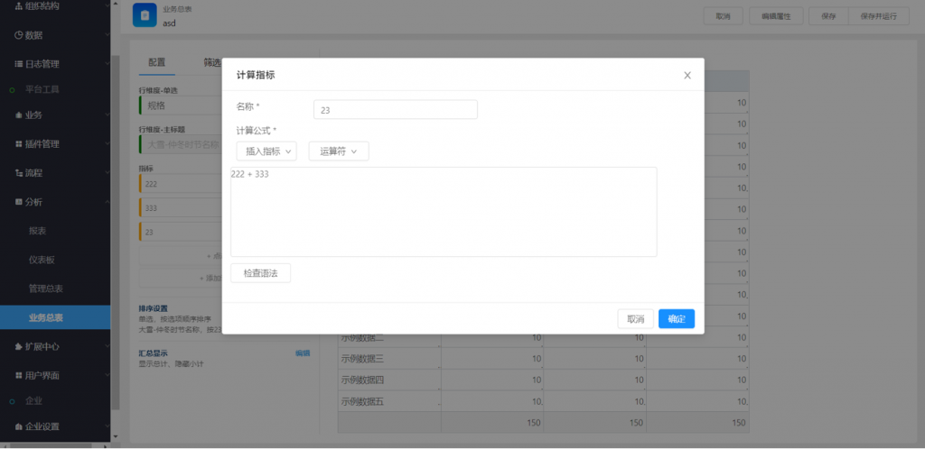 1) 與管理總表類似,業(yè)務(wù)總表中增加了計(jì)算指標(biāo),支持指標(biāo)列之間進(jìn)行簡(jiǎn)單四則運(yùn)算,滿足更多的分析場(chǎng)景