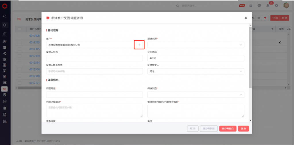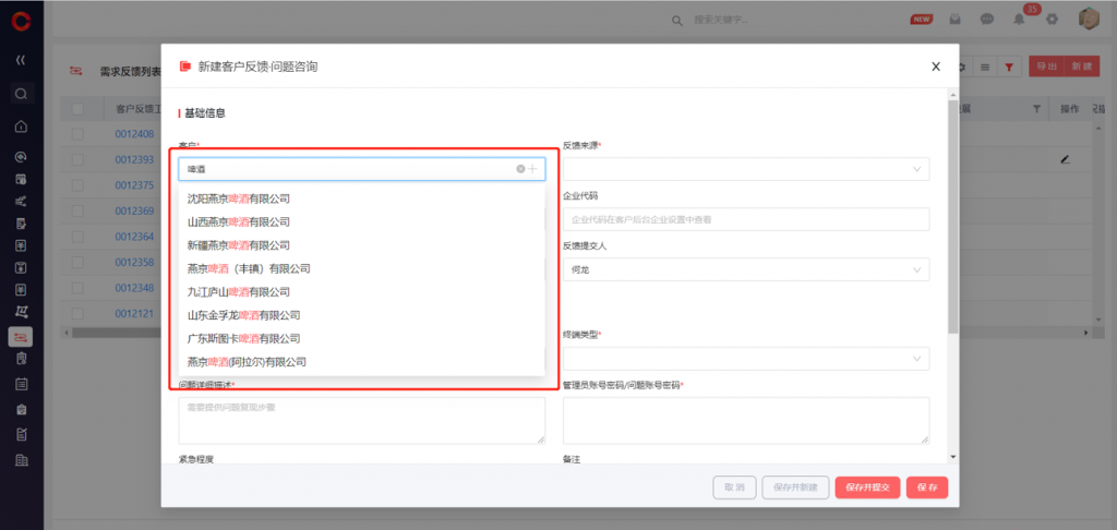 1)新建編輯數(shù)據(jù)時(shí),查找關(guān)系字段支持快速搜索和選擇,免除進(jìn)入彈窗頁(yè)的多級(jí)操作,直接通過(guò)主標(biāo)題查找完成選擇,提高數(shù)據(jù)錄入效率