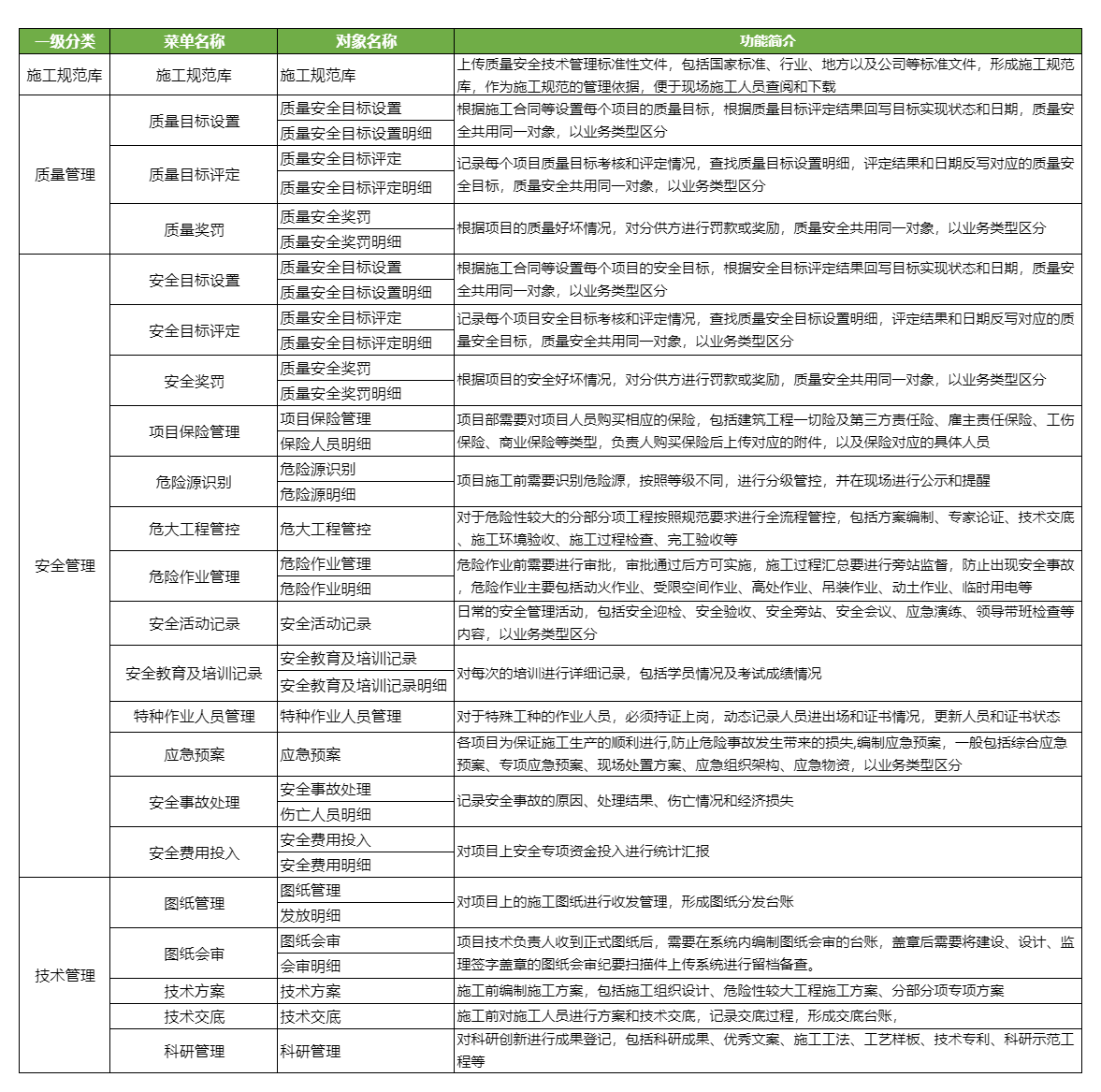 ● 工管理內(nèi)容主要針對大型總包項目施工現(xiàn)場業(yè)務(wù)管理,主要包括質(zhì)量、安全、技術(shù)管理,通過競品分析和客戶業(yè)務(wù)分析,梳理出通用性較強、使用較多的功能點,滿足客戶對現(xiàn)場施工管理需求。
