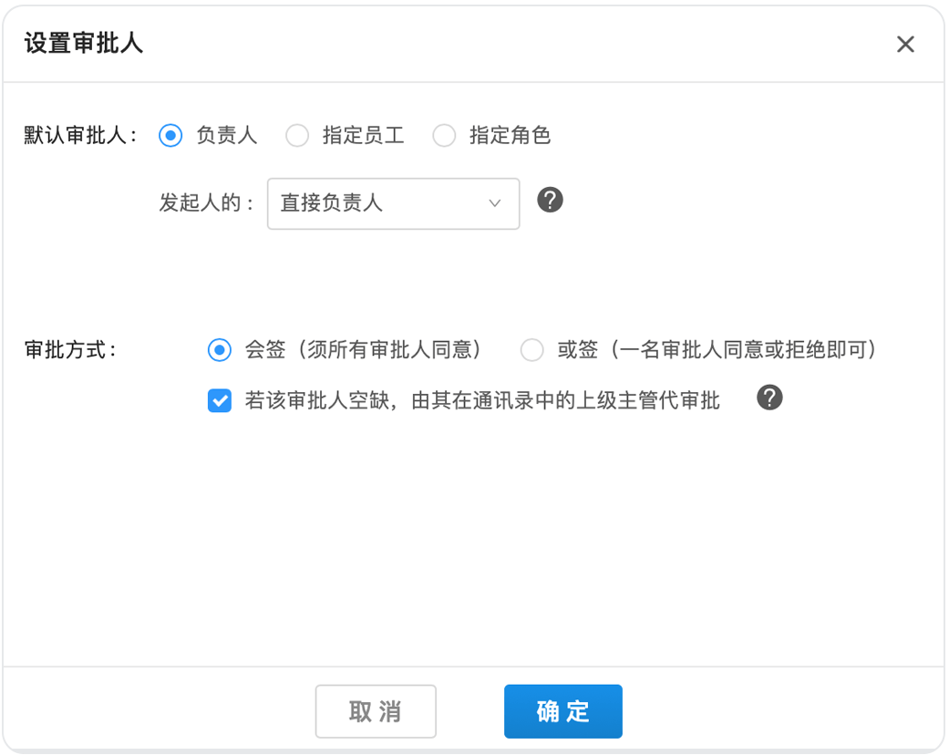 員工小王準備報銷一筆出差交通費用。公司財務(wù)規(guī)定,所有報銷都應(yīng)先由員工的直屬領(lǐng)導(dǎo)審批,再由財務(wù)審核員審批。對于這種場景,企業(yè)可以在第一個環(huán)節(jié)使用“負責(zé)人”類型審批人節(jié)點,并設(shè)定為發(fā)起人的直接負責(zé)人審批,這樣不同員工發(fā)起報銷時,系統(tǒng)就會自動將審批流程發(fā)送給他的直屬領(lǐng)導(dǎo)了。