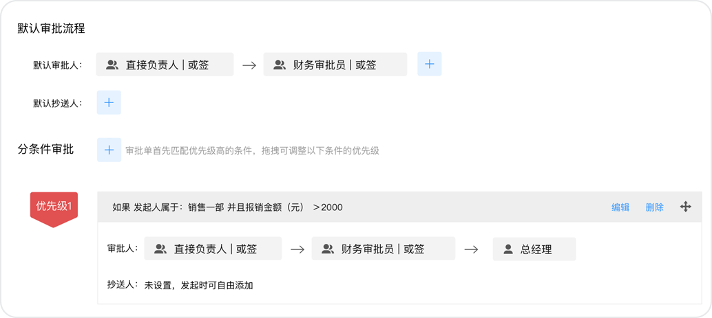 小王這次要報銷2500元的出差費用,而公司規(guī)定報銷超出2000元就需要總經(jīng)理進行額外審批。這種情況可以通過設(shè)置“分條件審批”功能來實現(xiàn),將報銷金額是否大于2000作為判斷應(yīng)該走哪一條流程的條件:1)金額小于等于2000元時,流程按“直接負責(zé)人-財務(wù)審核員”執(zhí)行;2)金額大于2000元時,流程按“直接負責(zé)人-財務(wù)審核員-總經(jīng)理”執(zhí)行。分條件審批不僅可以設(shè)置按金額判斷,還可以設(shè)置按發(fā)起人部門、報銷類型等判斷。