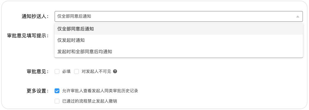 小王的出差報銷最終通過了,這時還需要抄送給辦公室的行政同事以便日后進行成本分析。過去,報銷審批一經(jīng)發(fā)起就抄送給了行政同事,但有些審批后期撤銷了但沒有通知行政同事,造成后期分析時數(shù)據(jù)存在誤差,現(xiàn)在可以通過設(shè)置“僅全部同意后通知”的抄送模式來避免這一問題。抄送共有3種模式,企業(yè)可根據(jù)實際場景靈活選擇。