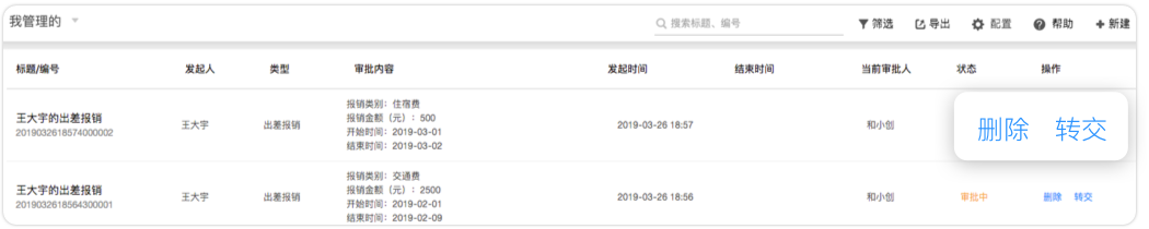 小王平時不僅會提交“出差報銷”這種辦公類審批,還會提交“合同審核”這種經(jīng)營類審批。公司希望每類審批都由專人來管理模板與數(shù)據(jù),防止敏感數(shù)據(jù)內(nèi)部泄露。這時公司可以為每個審批設(shè)置“模板管理員”,由該審批生成的全部數(shù)據(jù)將只能由這個模板管理員維護并導(dǎo)出。同時他也可以將審批中的流程轉(zhuǎn)交給其他人,以避免出現(xiàn)審批人休假或離職后流程卡住的情況。模板管理員還可以協(xié)助企業(yè)管理員來編輯審批模板,有效分擔(dān)工作。