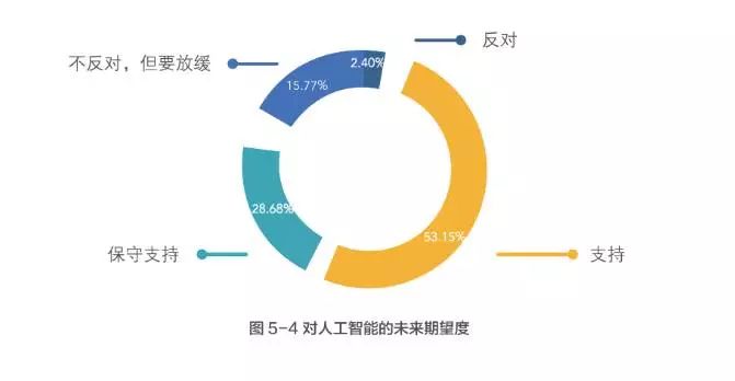 1)國民認知:國民對人工智能認知度高,超半數(shù)受訪者支持其全面發(fā)展。今日頭條的問卷調(diào)查顯示,只有6.23%的受訪者對人工智能不了解;53%受訪者支持人工智能全面發(fā)展,而持保守態(tài)度的為27%。