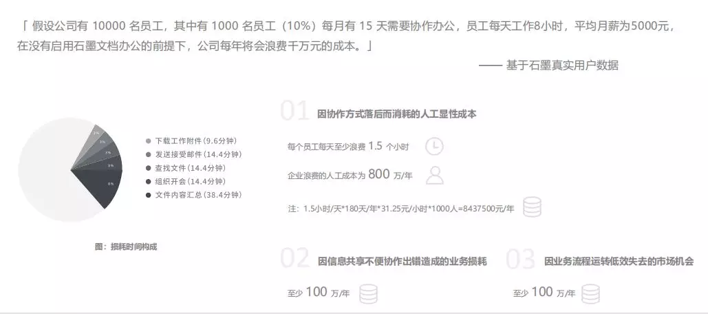 集腋成裘,員工每天花費(fèi)在傳輸文件、查找文件、內(nèi)容匯總、文件傳輸上的時(shí)間并不是個(gè)小數(shù)目。對于一家10000 人規(guī)模的企業(yè)來說,每天至少要耗費(fèi) 90 分鐘的無效時(shí)間,這直接導(dǎo)致企業(yè)每年需要付出將近 800 萬元的無效成本。