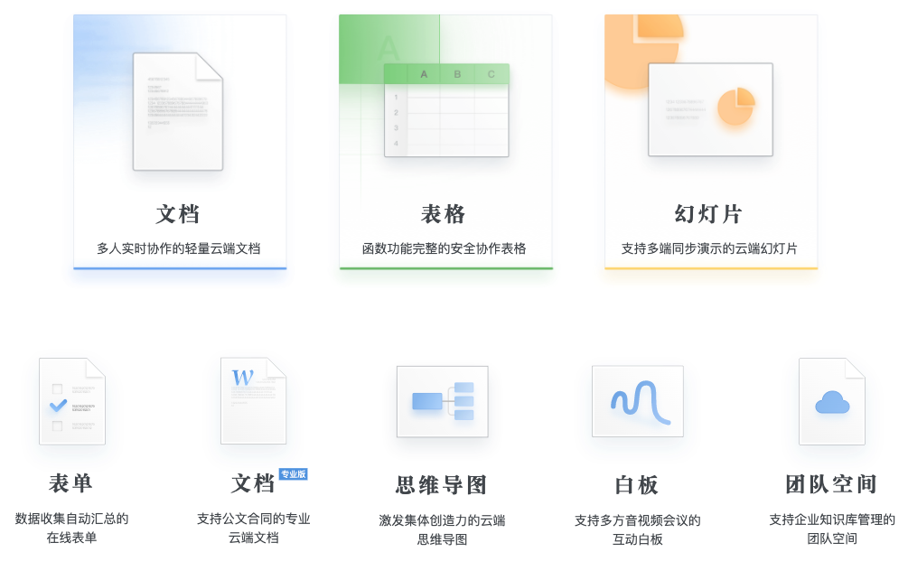石墨文檔發(fā)展至今,已有產(chǎn)品線包含文檔、表格、表單、幻燈片、思維導(dǎo)圖、白板、團(tuán)隊(duì)空間等,基本可以滿足企業(yè)辦公場景中的常見需求。