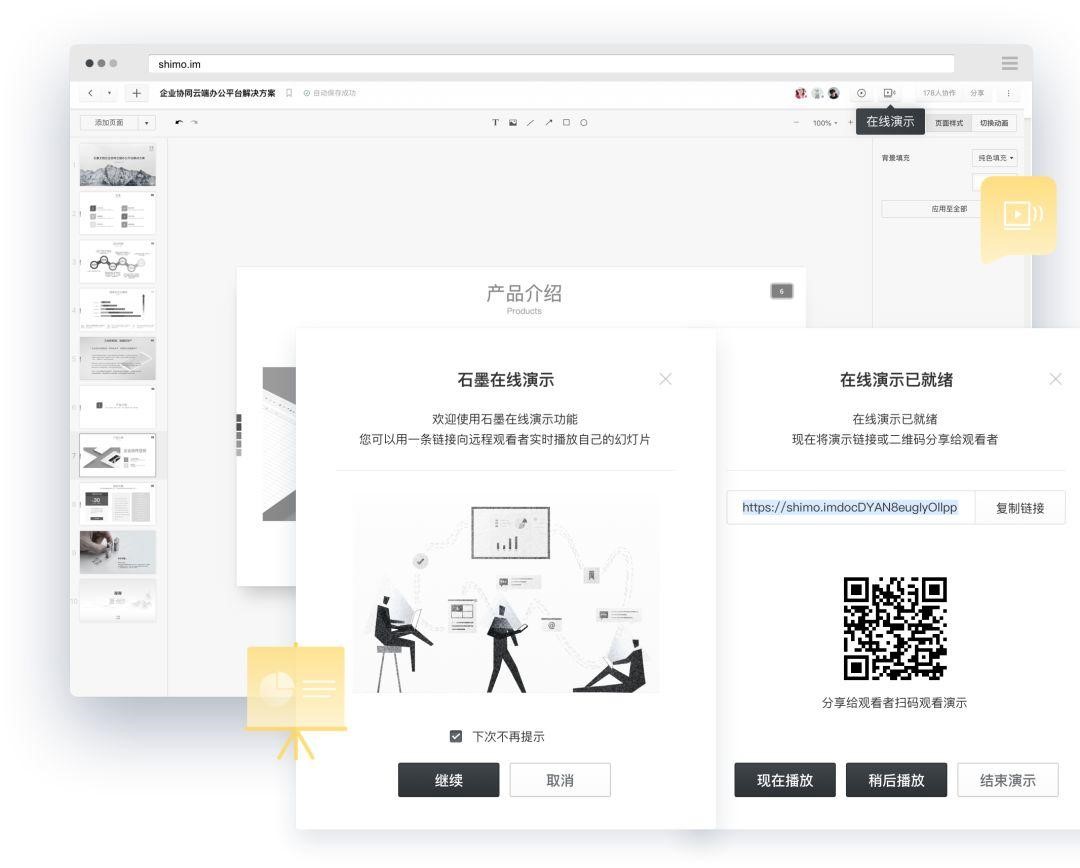 石墨還提供支持多人協(xié)作的幻燈片,團(tuán)隊(duì)成員可通過二維碼、鏈接分享給觀眾,無論身在何方,演示時(shí)觀眾只需打開電腦、手機(jī)、Pad 等設(shè)備就能實(shí)時(shí)同步播放,即使遠(yuǎn)隔萬里也如同在一個(gè)會(huì)議室面對面交流。