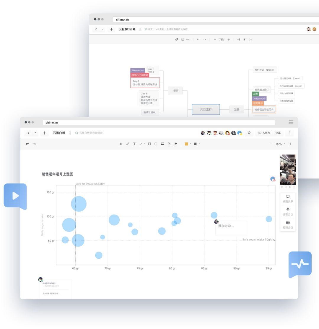石墨白板讓遠(yuǎn)程會(huì)議更加高效便捷,多位成員通過音視頻連線,圍繞一個(gè)話題各抒己見,邊聊邊寫,邊聊邊畫,討論思路與結(jié)果同步呈現(xiàn)。
