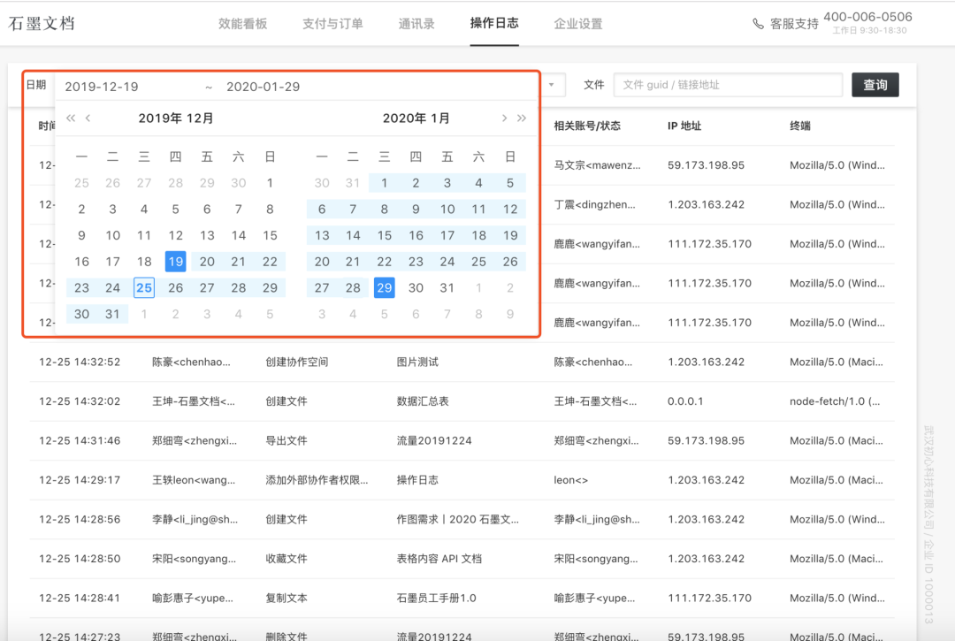 企業(yè)創(chuàng)建者和管理員在后臺可以查詢某一時(shí)間段的所有操作日志。