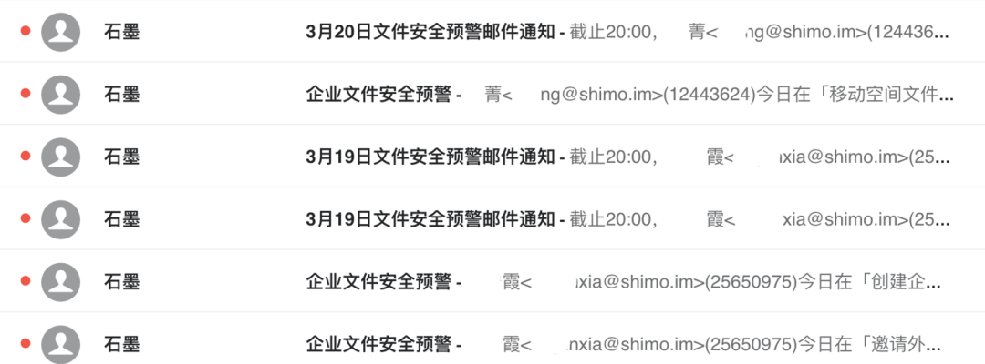 石墨文檔提供的「文件安全預(yù)警」功能,可以幫助企業(yè)實(shí)時(shí)監(jiān)控文件異常狀態(tài),短時(shí)間員工大量復(fù)制、導(dǎo)出企業(yè)文件等異常操作,企業(yè)會(huì)自動(dòng)收到郵件通知,降低損失。