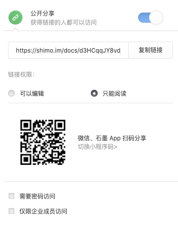 設(shè)置文檔公開分享時(shí),可在石墨中設(shè)置“需要密碼訪問”或“僅限企業(yè)成員訪問”,從而實(shí)現(xiàn)文檔的定點(diǎn)定向傳輸,并可有效杜絕內(nèi)部文檔外泄。