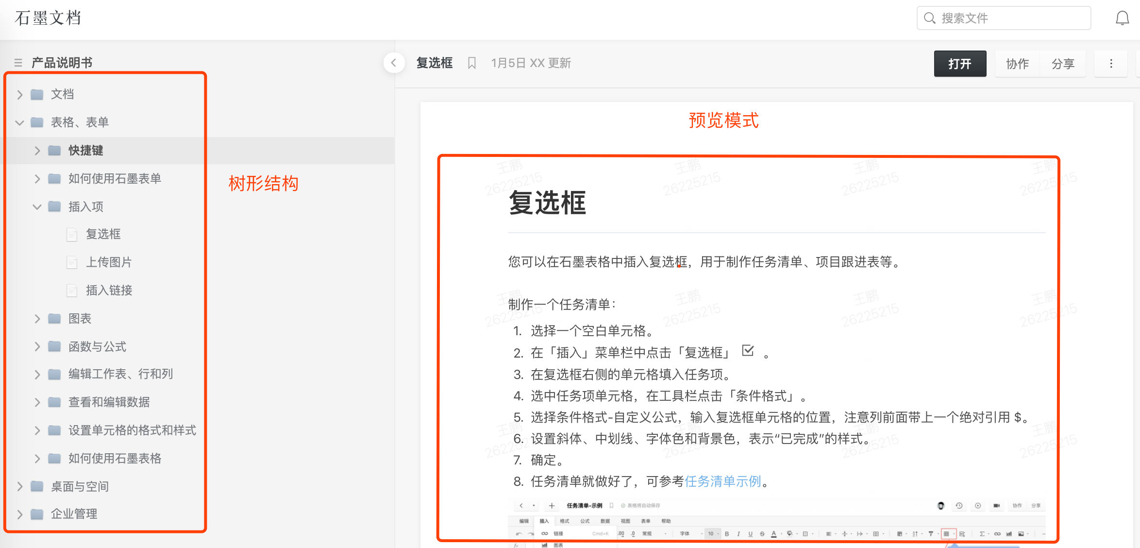 石墨的樹形結(jié)構(gòu)還提供預(yù)覽模式,用戶可直接在左側(cè)的空間目錄點(diǎn)擊文件夾或文件,右側(cè)實(shí)時(shí)預(yù)覽,查看文件內(nèi)容。
