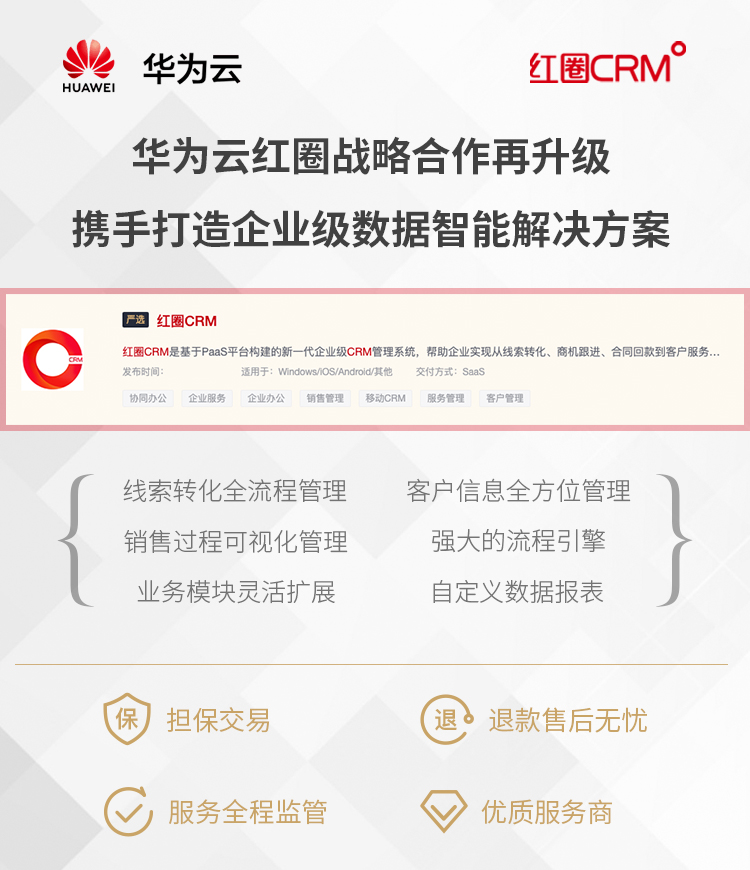 日前,繼2019年作為首批加入華為云WeLink的生態(tài)伙伴和唯一CRM系統(tǒng)服務(wù)商后,紅圈與華為云戰(zhàn)略合作持續(xù)升級,再次在華為云嚴(yán)選商城發(fā)布了紅圈 CRM企業(yè)級移動銷售自動化管理系統(tǒng)。旨在基于華為云整體公有云解決方案的基礎(chǔ)上,為中大型企業(yè)、集團公司用戶提供更加優(yōu)質(zhì)的數(shù)據(jù)智能解決方案,幫助企業(yè)實現(xiàn)從線索轉(zhuǎn)化、商機跟進、合同回款到客戶服務(wù)的LTC全流程精細(xì)化管理,提升企業(yè)競爭力,推動企業(yè)業(yè)績增長。