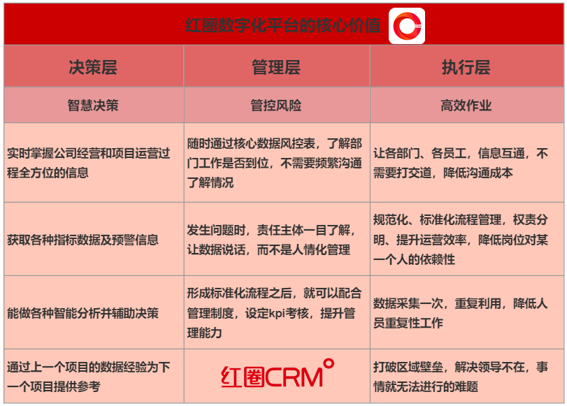 紅圈工程項(xiàng)目管理系統(tǒng)可實(shí)現(xiàn)數(shù)字管理。數(shù)據(jù)資產(chǎn)沉淀和分析,?撐組織決策。 服務(wù)于企業(yè)階段性目標(biāo)的達(dá)成。 以組織建設(shè)、?才選拔,人才復(fù)制,提升組織能力。