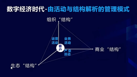 我們對(duì)于今天任何一個(gè)企業(yè)的數(shù)字化轉(zhuǎn)型,大家記住,跟工業(yè)時(shí)代不太一樣的是你得完成三個(gè)結(jié)構(gòu):一個(gè)結(jié)構(gòu)是現(xiàn)在有的組織架構(gòu),一個(gè)是你跟顧客關(guān)系的商業(yè)結(jié)構(gòu),還有一個(gè)是你跟產(chǎn)業(yè)關(guān)系的生態(tài)結(jié)構(gòu)。你必須得三個(gè)結(jié)構(gòu)都做到。如果你沒有能力,從組織結(jié)構(gòu)這個(gè)系統(tǒng)完成運(yùn)營(yíng)跟業(yè)務(wù)活動(dòng),從商業(yè)結(jié)構(gòu)這個(gè)系統(tǒng)完成業(yè)務(wù)跟產(chǎn)業(yè)活動(dòng),然后從產(chǎn)業(yè)結(jié)構(gòu)這個(gè)系統(tǒng)完成運(yùn)營(yíng)跟產(chǎn)業(yè)活動(dòng),你是不可能做數(shù)字化轉(zhuǎn)型的。