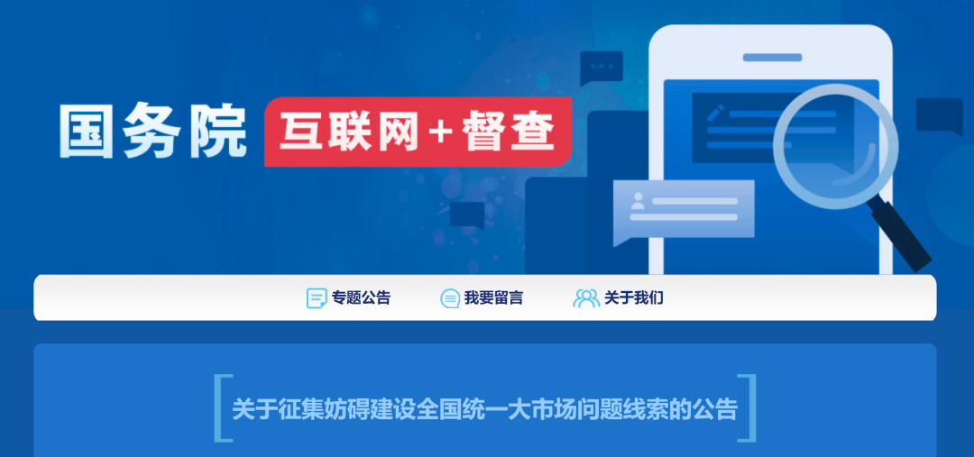 9月25日,國務(wù)院辦公廳發(fā)布《關(guān)于征集妨礙建設(shè)全國統(tǒng)一大市場問題線索的公告》。公告明確,為貫徹落實(shí)《中共中央 國務(wù)院關(guān)于加快建設(shè)全國統(tǒng)一大市場的意見》,推動解決妨礙建設(shè)全國統(tǒng)一大市場的突出問題,國務(wù)院“互聯(lián)網(wǎng)+督查”平臺從即日起面向社會征集七個(gè)方面的問題線索和意見建議: