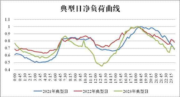 由于湖南光伏發(fā)電裝機的快速增長,湖南電網(wǎng)凈負荷曲線(電網(wǎng)凈負荷=電網(wǎng)負荷-新能源出力-外受電)產(chǎn)生向“鴨子型曲線”轉(zhuǎn)變的趨勢(見圖),午間腰荷時段凈負荷越來越低,該時段可再生能源消納困難情況開始顯現(xiàn)。以2023年某日為例,該日光伏發(fā)電出力較大,腰荷時段電網(wǎng)凈負荷較前兩年同期明顯下降,同時低于當(dāng)日低谷時段凈負荷,導(dǎo)致腰荷時段新能源消納更為困難。