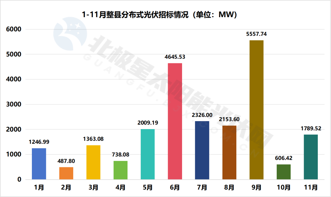 從時(shí)間分布的角度來看,除了2月、4月和10月之外,每個(gè)月的招標(biāo)規(guī)模均達(dá)到了GW級別。其中,9月和6月的招標(biāo)規(guī)模尤為突出,分別達(dá)到了5557.74MW和4645.53MW。
