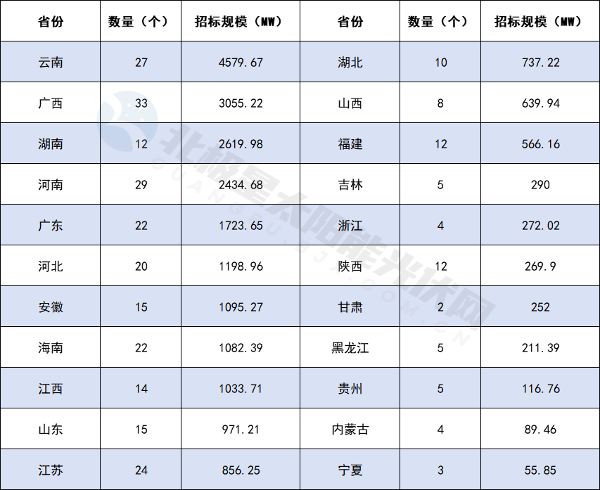 其中,云南以27個(gè)項(xiàng)目的總規(guī)模4579.67MW排名第一,而廣西則以33個(gè)項(xiàng)目的總規(guī)模3055.22MW緊隨其后。另外,湖南、河南、廣東、河北、安徽、海南、江西等省份的項(xiàng)目規(guī)模也達(dá)到了GW級別。
