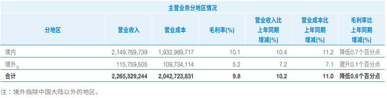 境外業(yè)務(wù)深耕經(jīng)營(yíng),新簽合同額1860億元,同比增長(zhǎng)12.3%,營(yíng)業(yè)收入1158億元,同比增長(zhǎng)7.2%。