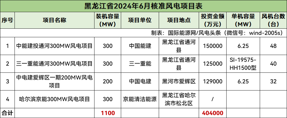 黑龍江核準(zhǔn)4個風(fēng)電項(xiàng)目,總規(guī)模1100MW,總投資404000萬元,均為陸上風(fēng)電項(xiàng)目。