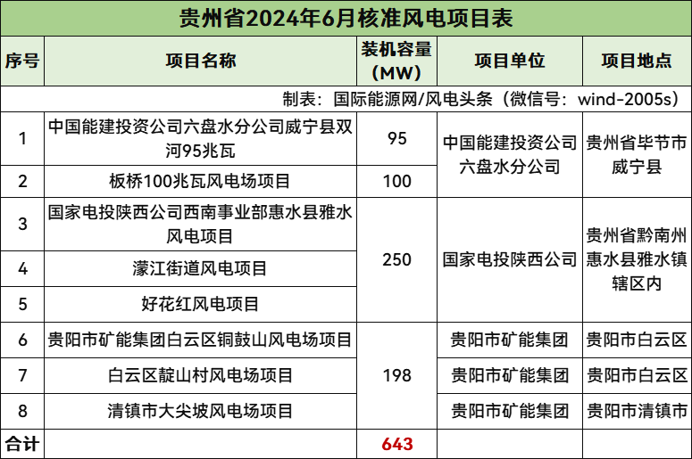 貴州核準(zhǔn)8個風(fēng)電項(xiàng)目,總規(guī)模643MW,均為陸上風(fēng)電項(xiàng)目。