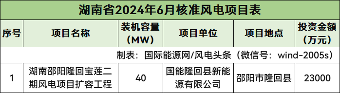 湖南核準(zhǔn)1個風(fēng)電項(xiàng)目,總規(guī)模40MW,總投資23000萬元,為陸上風(fēng)電項(xiàng)目。
