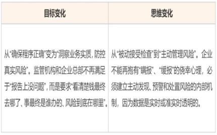 從目標(biāo)與思維看,過去監(jiān)管更關(guān)注“程序正確”,企業(yè)也常抱有“被動(dòng)接受檢查”的心態(tài);如今則轉(zhuǎn)向“洞察業(yè)務(wù)實(shí)質(zhì)、防控真實(shí)風(fēng)險(xiǎn)”——監(jiān)管機(jī)構(gòu)與企業(yè)總部不僅要“報(bào)告沒問題”,更要“看清錢去哪、事誰辦、風(fēng)險(xiǎn)在哪”,企業(yè)也必須建立主動(dòng)發(fā)現(xiàn)、預(yù)警、處置風(fēng)險(xiǎn)的機(jī)制,畢竟數(shù)據(jù)已實(shí)現(xiàn)實(shí)時(shí)或準(zhǔn)實(shí)時(shí)透明。