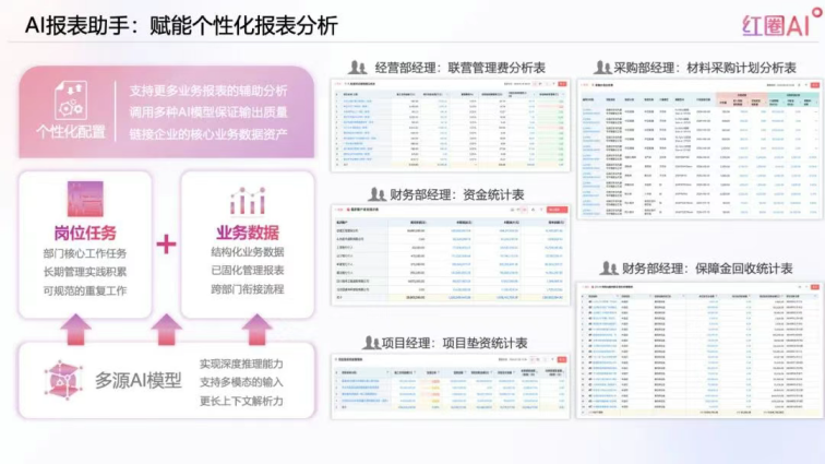 過(guò)去,財(cái)務(wù)、經(jīng)營(yíng)、項(xiàng)目等部門要花幾天時(shí)間做報(bào)表,結(jié)果還只是 “數(shù)據(jù)的堆砌”;現(xiàn)在,AI 報(bào)表助手能自動(dòng)生成多維度管理報(bào)表,比如材料采購(gòu)計(jì)劃分析、項(xiàng)目墊資統(tǒng)計(jì)、聯(lián)營(yíng)管理費(fèi)分析等,還能自定義配置報(bào)表維度,滿足不同崗位的需求。更進(jìn)階的是 “項(xiàng)目 360°AI 解讀”:系統(tǒng)會(huì)綜合項(xiàng)目的進(jìn)度、成本、質(zhì)量、安全數(shù)據(jù),自動(dòng)對(duì)比目標(biāo)與實(shí)際的差異 —— 比如發(fā)現(xiàn)某項(xiàng)目成本超支,會(huì)精準(zhǔn)定位是 “材料價(jià)格上漲” 還是 “用量超標(biāo)”;還能預(yù)警潛在風(fēng)險(xiǎn),比如 “某項(xiàng)目進(jìn)度滯后可能影響現(xiàn)金流”,并給出調(diào)整建議。