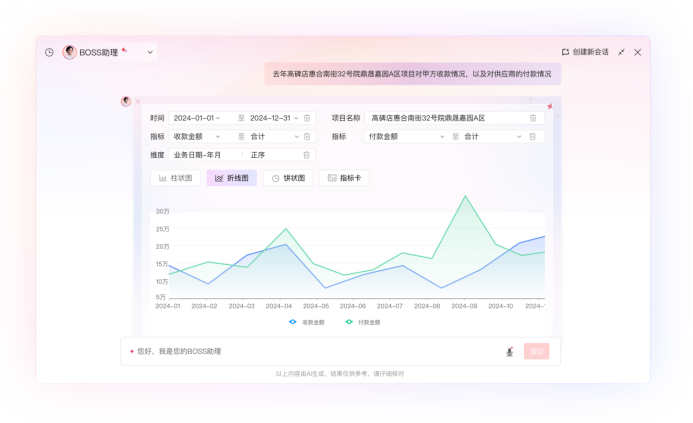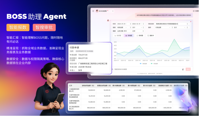 在具體應(yīng)用中,BOSS助理可快速鎖定數(shù)據(jù),例如查詢“張偉昨天提交的審批”,AI通過(guò)意圖識(shí)別下發(fā)指令,系統(tǒng)在判斷權(quán)限后返回列表,精準(zhǔn)調(diào)取對(duì)應(yīng)審批,實(shí)現(xiàn)急事優(yōu)先快速處理。此外,它還能響應(yīng)諸如“查看高碑店項(xiàng)目各供應(yīng)商支付情況”的復(fù)雜查詢,直接呈現(xiàn)合同金額、結(jié)算金額、支付金額等關(guān)鍵指標(biāo),幫助管理者快速發(fā)現(xiàn)異常并追溯源頭。