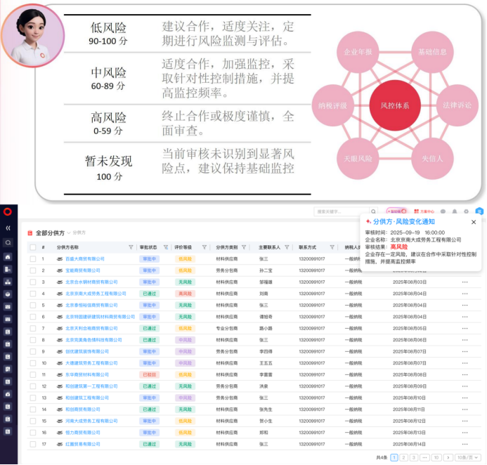 采購(gòu)助理還支持定期智能排查,自動(dòng)刷新已合作供應(yīng)商風(fēng)險(xiǎn)等級(jí),針對(duì)高風(fēng)險(xiǎn)供應(yīng)商及時(shí)預(yù)警,并可設(shè)置限制合作標(biāo)準(zhǔn),快速終止合作并系統(tǒng)溯源追查。通過(guò)構(gòu)建涵蓋組織架構(gòu)、企業(yè)年報(bào)、納稅評(píng)級(jí)、法律訴訟、天眼風(fēng)險(xiǎn)、失信人等維度的風(fēng)險(xiǎn)矩陣,采購(gòu)助理為企業(yè)建立起科學(xué)、透明、高效的供應(yīng)商管理體系。